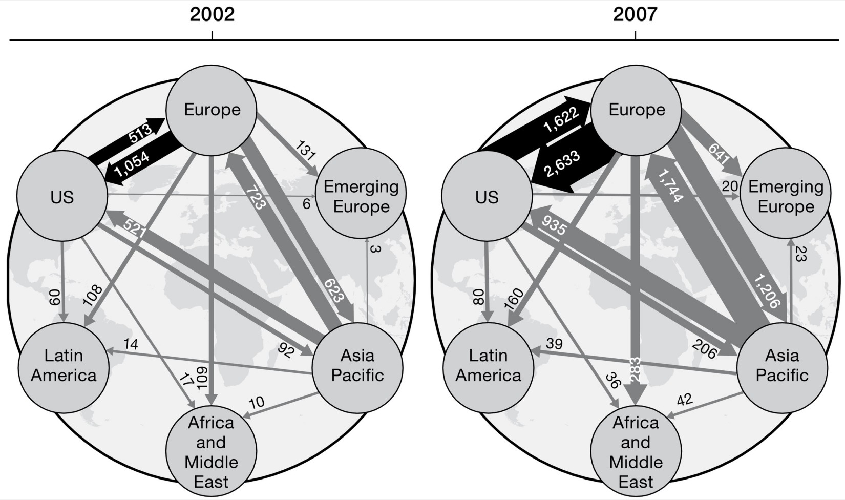Note: The thickness of the arrows indicates the size of the outstanding stock of claims. The direction of the arrows indicates the direction of the claims: Arrows directed from region A to region B indicate lending from banks located in region A to borrowers located in region B.