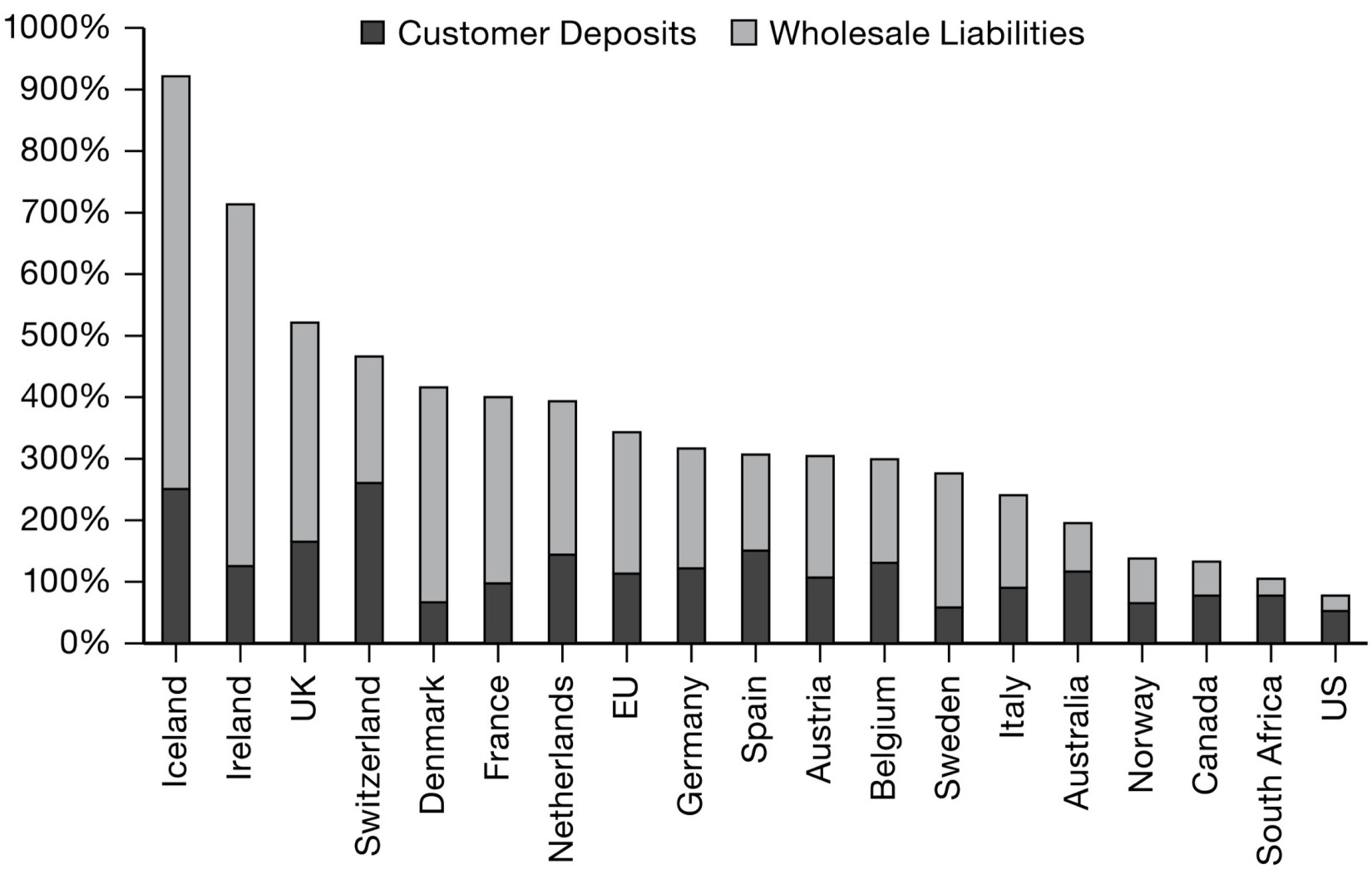 How badly such a facility was needed becomes clear only when we put together the local and global activities of Europe’s banks, to get a full view of their spectacularly overinflated growth. America’s banks were very big and very important to global finance. But it was in Europe that bank finance had grown most disproportionately. 47 Europe’s banks had always been large. Unlike the United States, where equity and bond markets were the main sources of business finance, Europe’s economies had long relied heavily on bank lending. But spreading out across the EU and feeding off the transatlantic financial circuit, the European banks had grown to gargantuan size. In 2007 the three largest banks in the world by assets were all European—RBS, Deutsche Bank and BNP. Combined, their balance sheets came to 17 percent of global GDP. The balance sheet of each of them came close to matching the GDP of its home country—Britain, Germany and France—the three largest economies in the EU. 48 In tiny Ireland the situation was far more extreme. The liabilities of its banks added up to 700 percent of GDP. France and the Netherlands rivaled each other, with liabilities at 400 percent of GDP. The banks of Germany and Spain had liabilities amounting to 300 percent of GDP. By this standard every member of the eurozone was at least three times more “overbanked” than the United States. Furthermore, Europe’s banks were far more dependent on volatile “wholesale,” market-based funding than their US counterparts.