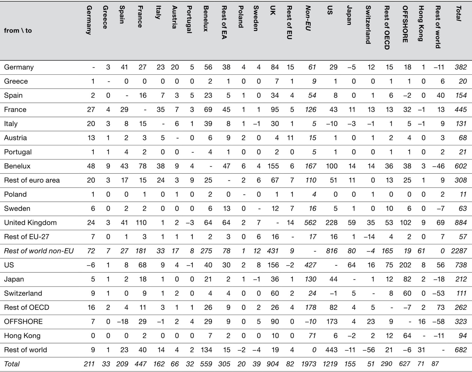 Thanks to the work of economists at the European Commission, we can map the flow of funds within Europe as part of the broader circulation of funds throughout the world economy. In the bottom right-hand quadrant of the following table, we see the outline of the world economy that we have mapped in previous chapters. But if we focus on intra-European flows, it is clear that Germany, despite its export prowess, did not dominate the European financial system. Germany was the largest net lender. Its status was like that of China in relation to the US economy. But financial flows within Europe no more mapped onto trade than they did in the world economy. Germany was a champion exporter of cars and machinery, but in banking and finance others led the field. The UK, France, the Benelux and Ireland (the latter hidden within the category “Rest of Euro area”) were the key hubs for financial flows. The City of London, home to banks from around the world, including all the leading German banks, stands out as the major financial partner for every eurozone member, even though it was not a member of the currency union. France and the Benelux were particularly important because they served as channels through which funds flowed into the eurozone from the outside. American and other lenders from the rest of the world clearly preferred to do business with well-known French, Dutch and Belgian counterparties, who then channeled the funds to the European periphery. France was a major financial hub, not because it had a huge trade surplus but because it had large, ambitious banks that were willing to borrow to lend: 445 billion euros flowed out of France and 447 billion flowed in, leaving a net imbalance of merely 2 billion euros. At the same time, 602 billion euros flowed out of the Benelux banking centers and 559 billion flowed in. The Dutch trade surplus made up the difference.