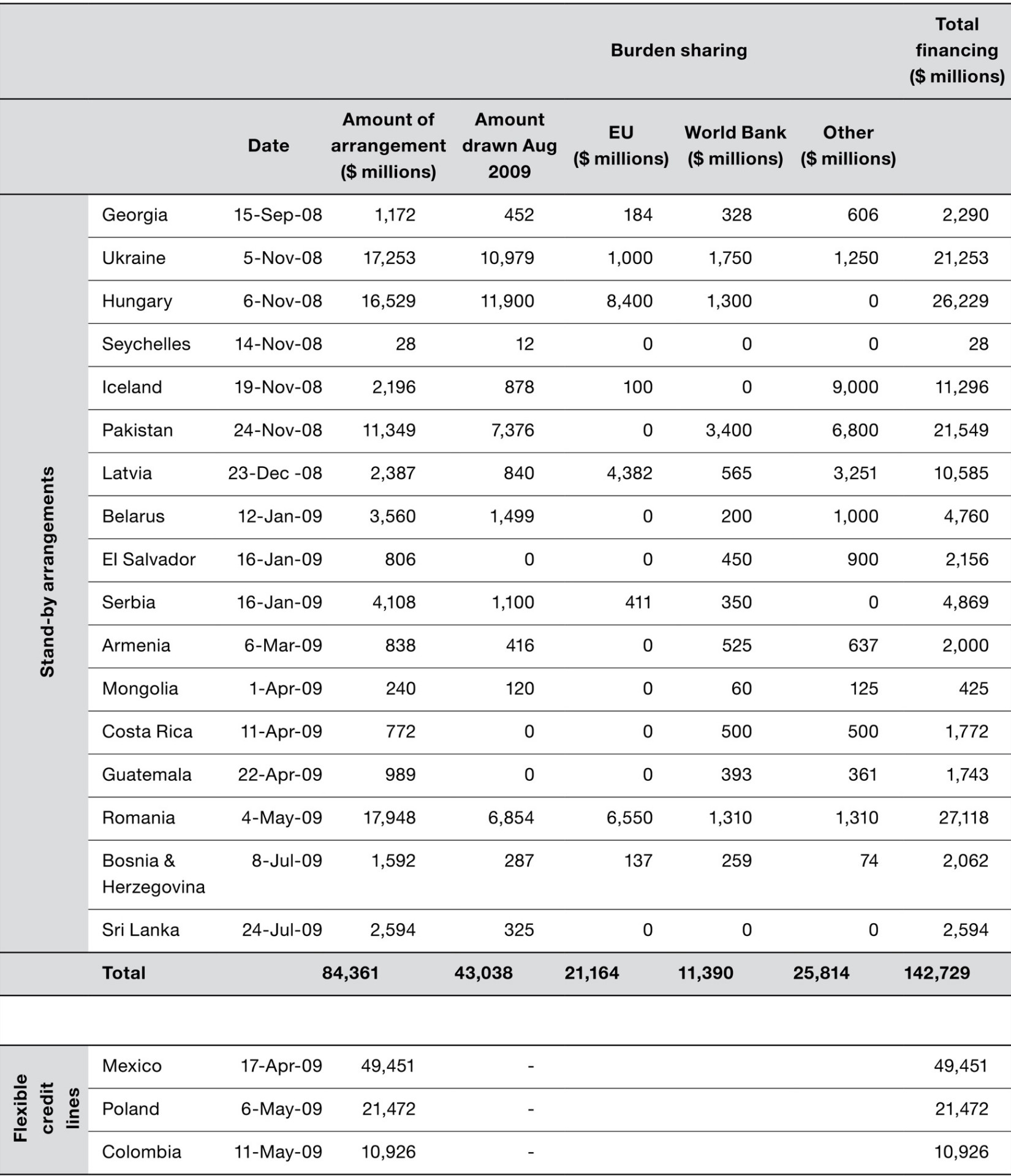 The IMF’s Hungarian aid package of October 2008 was followed by programs for Iceland, Latvia, Ukraine and Pakistan. 38 In 2009 Armenia, Belarus and Mongolia would be forced to apply to the IMF for help. Less than a year after it had played host to the contentious NATO summit, Bucharest found itself negotiating an IMF program. Precautionary credits would be offered to Costa Rica, El Salvador, Guatemala, Serbia, and Bosnia and Herzegovina. Additionally, at the urging of Washington, a new, minimally invasive flexible credit facility, offering a total of more than $80 billion in ready cash, was made available to Mexico, Poland and Colombia. Mexico thus had the singular distinction of receiving both a swap line and an IMF credit facility.