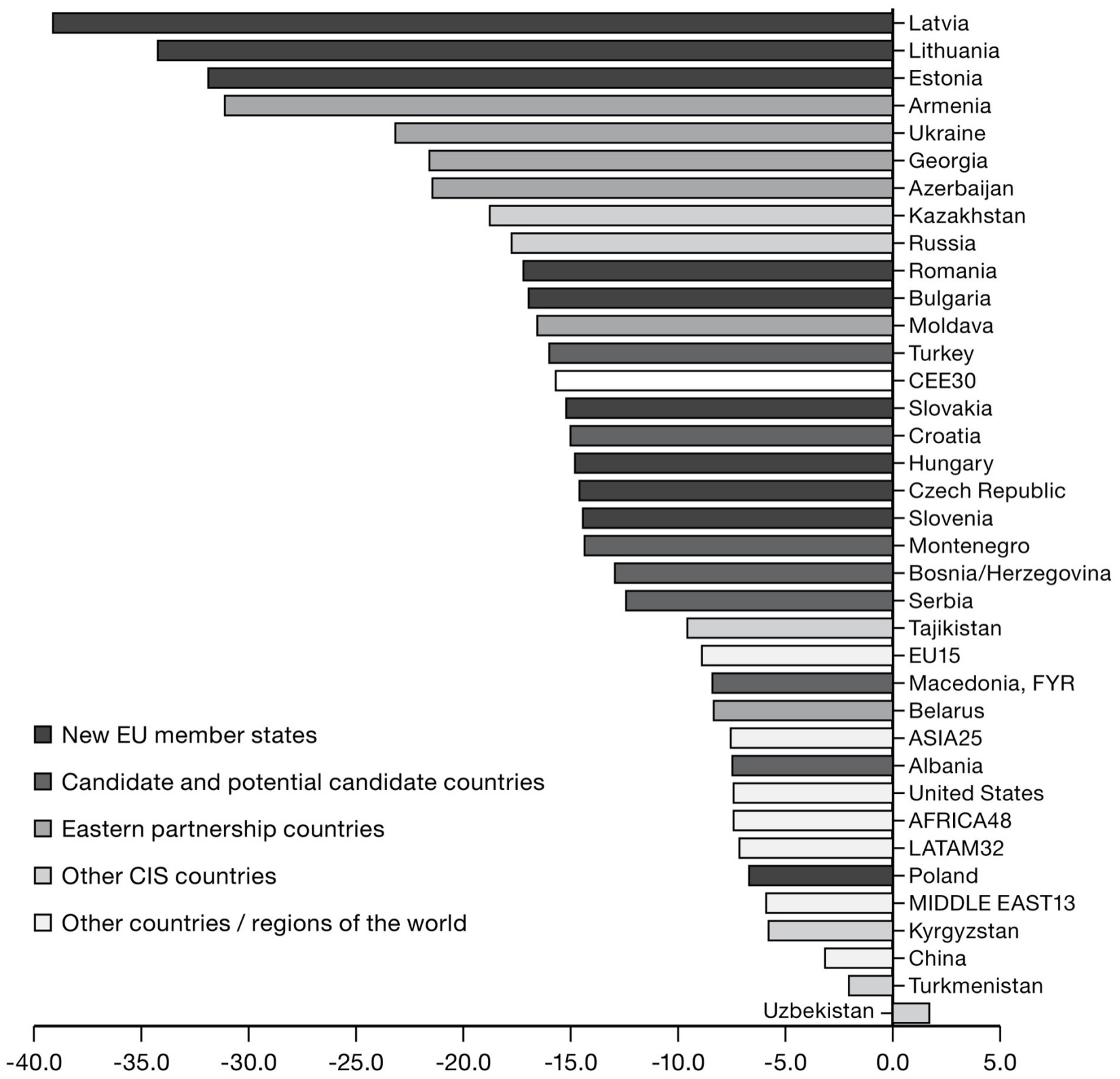The most extreme case was Latvia. One year into the crisis, in October 2009, the IMF’s forecast for Latvia’s GDP in 2010 was 39 percent lower than it had been in October 2007. Over the same two-year period, Estonia’s and Lithuania’s GDP expectations were revised downward by a whopping one-third. Slovenia, the Czech Republic, Slovakia, Hungary, Bulgaria and Romania all experienced downward shocks of between 15 and 18 percent, more than twice that suffered by the United States. In the adjoining post-Soviet Commonwealth of Independent States (CIS), the downward revision of growth expectations ranged from 18 percent for Russia to 32 percent for Armenia. The pattern was not uniform. Poland, notably, escaped largely unscathed. 26 But all the most severe casualties of the 2008–2009 crisis are to be found among the transition economies of the former Eastern bloc.