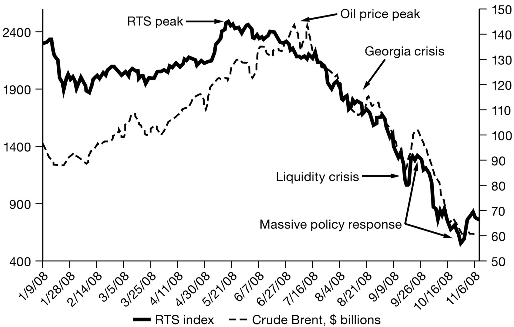 Source: World Bank in Russia, Russian Economic Report 17 (November 2008), figure 2.1. Data: RTS, Thomson Datastream.