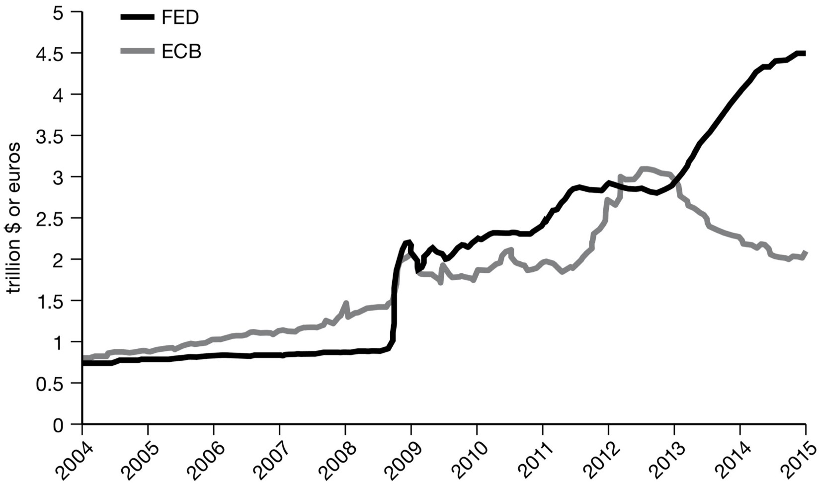 In his memoirs, Bernanke commented: “Like Mario Draghi, we were declaring we would do whatever it takes.” 63 But this was far too kind to the Europeans. Draghi’s OMT as it emerged by September 2012 was a conditional confidence-building measure. It worked by calming markets and stopping the panic. But beyond that it provided no stimulus to the eurozone economy. In truth, the ECB’s possibilities were limited. QE for Europe with Germany’s conservatives on the warpath was unthinkable. 64 As the eurozone economy stagnated and its banks deleveraged, the LTRO facilities were progressively paid back. Unlike the Fed, whose balance sheet Bernanke was actively expanding, the ECB’s balance sheet contracted back to where it had been in the crisis-ridden fall of 2011. Europe was sliding ever deeper into its second recession.
