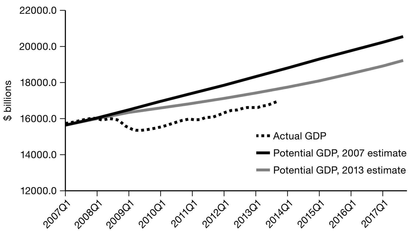 Source: Taken from L. H. Summers, “U.S. Economic Prospects: Secular Stagnation, Hysteresis, and the Zero Lower Bound,” Business Economics 49, no. 2 (2014): 65–74. Data: CBO.