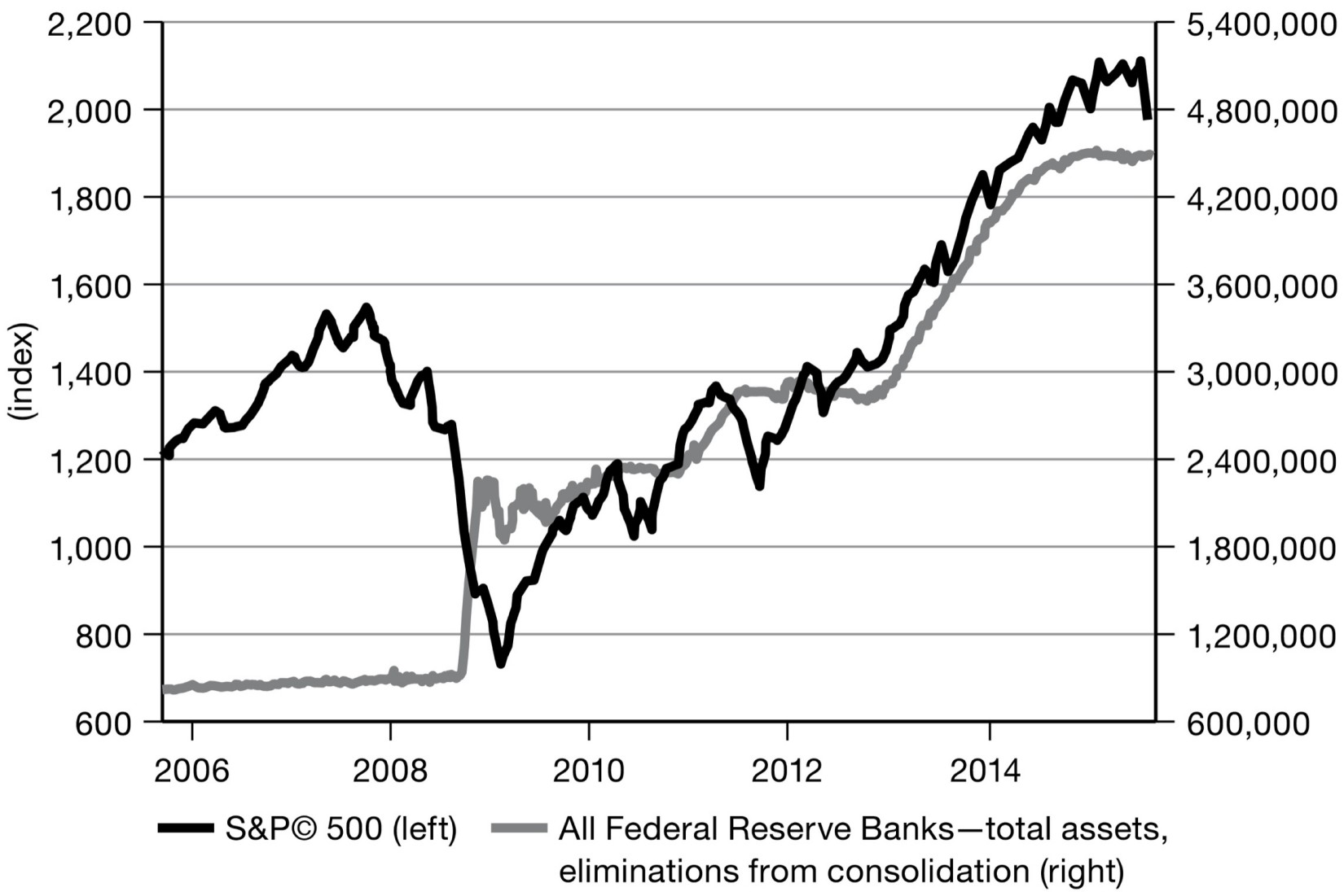 Both at home and abroad, the Fed’s low interest rate policy created a superheated investment climate. By its bond-purchasing program, which pushed up bond prices and depressed yields, the Fed incentivized investors to shift out of bonds and to place their funds in higher-risk, higher-return assets. How far this impulse actually went to explain the stock market boom is debatable. The econometric evidence is strongest for the impact of QE1 in launching the first phase of the stock market recovery in 2009. 2 But for the average Wall Street booster, the visual association between the Fed’s balance sheet and the surging value of the S&P 500 was plenty to be going along with. As a strategist for Citigroup told the Financial Times, “Everything revolves around monetary policy. It’s not the underlying economics that’s driving things, it’s central bank liquidity.” 3 In 2008 the Fed had intervened to stop the market from imploding. It had pumped trillions into the financial system. Now the markets hung on its every word.