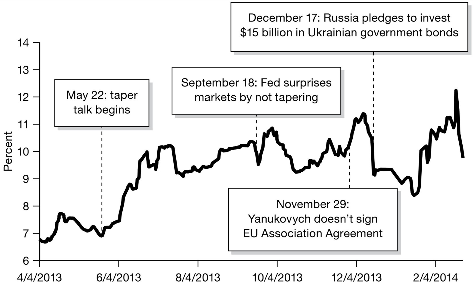 Up to the spring of 2013, under the impulse of the Fed’s quantitative easing, dollars flowed even to Ukraine. On April 10, 2013, Kiev turned down the latest offer from the IMF to help finance its gaping current account deficit and instead launched a 1.25 billion eurodollar bond issue, which was eagerly taken up by the markets at the comparatively modest interest rate of 7.5 percent. 34 But then Bernanke’s taper pronouncement of May 22 hit the markets. Interest rates surged to 10 percent. Searching for alternative sources of funding and personal enrichment, Yanukovych canvassed the world for options. He explored shale-gas development with Shell and Chevron. In the fall of 2013 a deal was on the books to lease to China an enormous holding of 7.5 million acres of prime farmland—5 percent of the entire land mass of Ukraine, 10 percent of its arable land, an area the size of Belgium. China was not just after Lebensraum. It was also offering to put $10 billion into port facilities in Crimea. 35 But it was the talks with the EU that were pivotal. The promise that Yanukovych had made to the Ukrainian population was the promise of Europe. Ukraine’s officially sponsored media were talking up the Association Agreement as a prelude to full membership. The EU gave no indication that that was likely, but it did nothing to deflate expectations. Western press sources billed the Vilnius summit quite openly as the climax of a “six-year campaign to lure Ukraine into integration with the EU and out of the Kremlin’s orbit.” 36