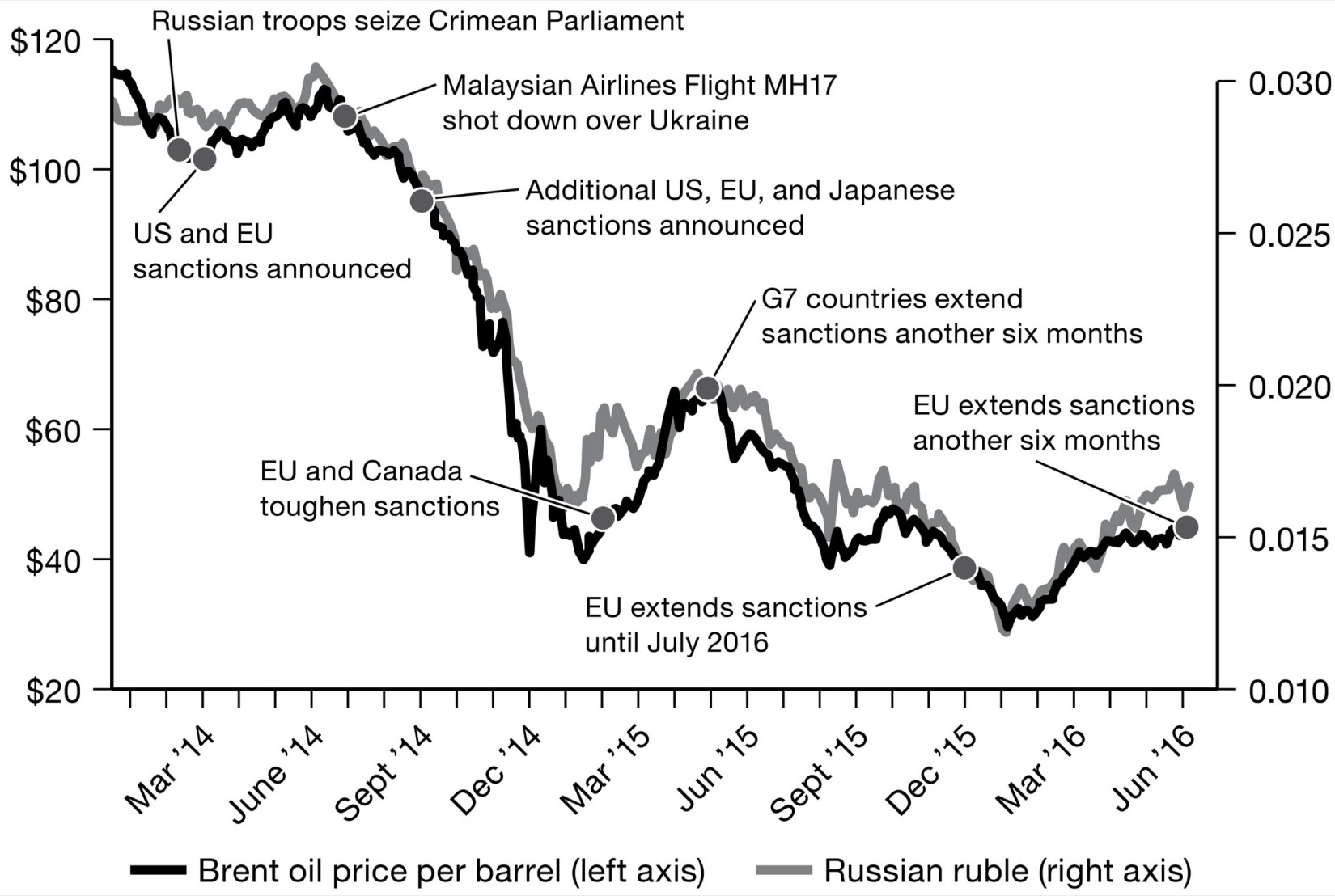 Oil politics are a rich field for conspiracy theory. There certainly are back channels between Washington and Riyadh. Secretary of State Kerry was in the gulf in the fall of 2014. The Saudis had every reason to act, if not over Ukraine then over Syria. 66 Along with Iran, Russia was the main backer of Assad’s die-hard regime. Saudi Arabia was its sworn enemy. There is no conclusive proof. Nor is a conspiracy necessary to explain these concurrent events. The oil market was under stress. America’s new fracking technology had opened up a new source of supply that was cheap and highly elastic. From the point of view of the Russian economy, in any case, the ultimate motivation was irrelevant. Oil prices plunged from $112 per barrel in June to around $60 per barrel by December 2014 and kept on falling. On top of sanctions and tightening credit conditions, it was a body blow.