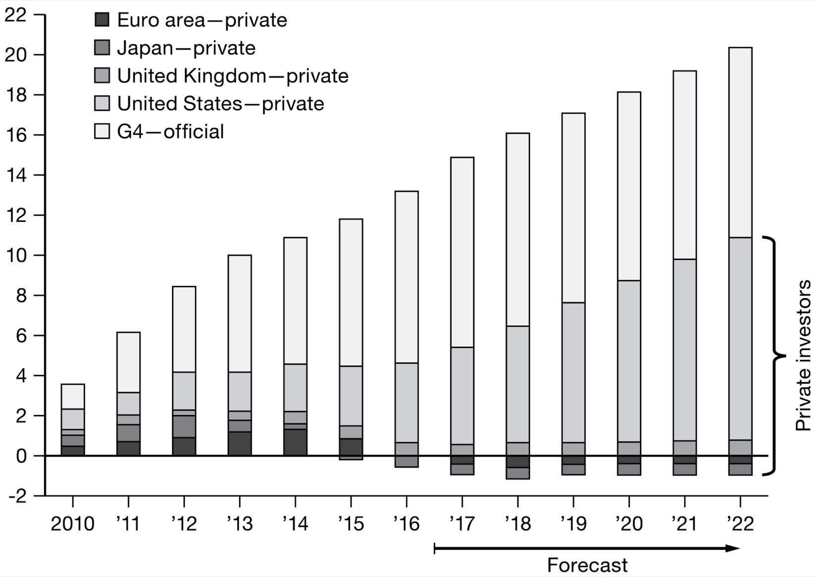 The congressional infighting over Obamacare and the Republican tax cuts was bare-knuckle American politics. But a clue to the relative calm in the Treasury market could be found in the same set of influences that had also preserved calm in the face of the Bush-era deficits of the early 2000s—the global demand and supply of safe assets. In the fall of 2017 the IMF published a remarkable table that showed the issuance of debt since 2010. 81 As this data revealed, austerity and QE had led to a major reshuffling of security portfolios. Given the budget-control measures adopted in Europe, the active bond buying by the ECB and the even greater activism of the Bank of Japan, they were, for the foreseeable future, not significant suppliers of safe assets to global investors. Not only was the ECB hoovering up eurozone bonds, but Germany, the chief supplier of European safe assets, was running a budget surplus. On a global scale over the next five years, the United States would be the only source of safe, Treasury-grade assets for investors worldwide. Whatever you might think of the Trump administration, if you needed to park a large volume of funds in safe government debt, there was no alternative to US Treasurys.