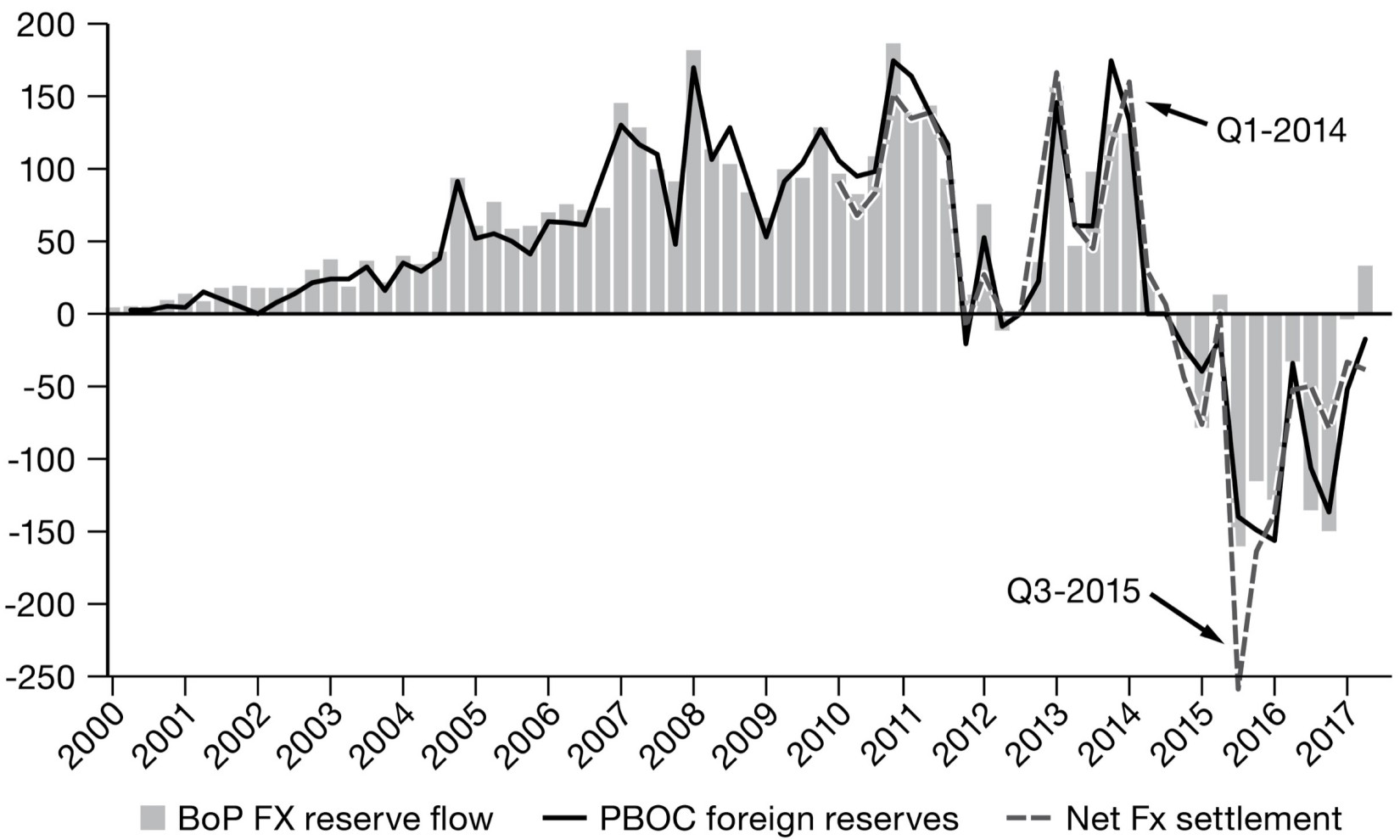 The Yuan Panic of 2015: Quarterly Inflows and Outflows from China (in $ billions)