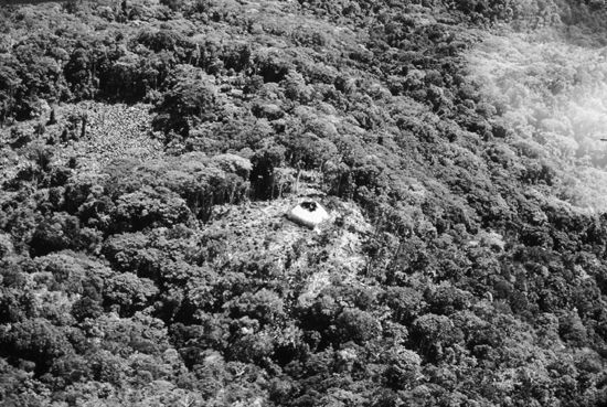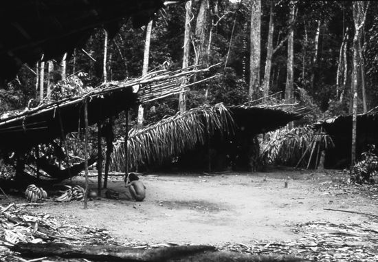 A hunting camp containing several yanos —temporary huts made with poles, vines, and leaves.