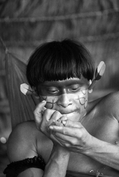 One of Matowä’s brothers then filled a snuff tube with ebene and gently blew it into several of the gourds containing his ashes, a postmortem aliquot of hallucinogen—possibly to enable the deceased Matowä to make one last contact with his beloved hekura spirits. Then the snuff tube itself was broken in half, the breaking point being measured off from the end by the length of one of Matowä’s rahaka arrow points. The broken snuff tube and the gourds were gently wrapped in leaves, tied with vines, and placed back into the structural roof poles, presumably for later ceremonies. It was growing dark when this ceremony ended. People slowly returned to their hammocks, added firewood to their hearths, blew on the coals until their fires danced, and retired for the night.