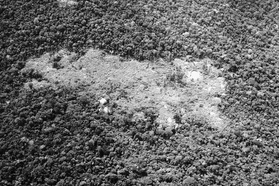 A large Yanomamö garden with two shabonos , indicating that the village is splitting into two separate groups but living he borara —close to each other. When the second and smaller group establishes a producing garden elsewhere, it will move there and make a new shabono.