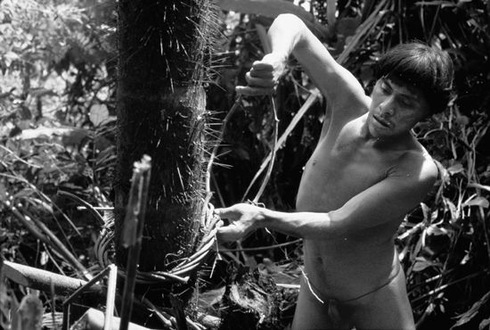 Kaobawä had to persuade the members of the two he borara groups to consolidate into one larger shabono —a palisaded shabono. Moreover, when the Monou-teri—some sixty people—temporarily moved in with them, the greater village would number over two hundred people and could field a much larger raiding party to deal with enemies. The Monou-teri would help with the construction of the new shabono and palisade, an upright wall of eight-foot-high posts that were buried into the ground a foot or so and then lashed together with strong vines.