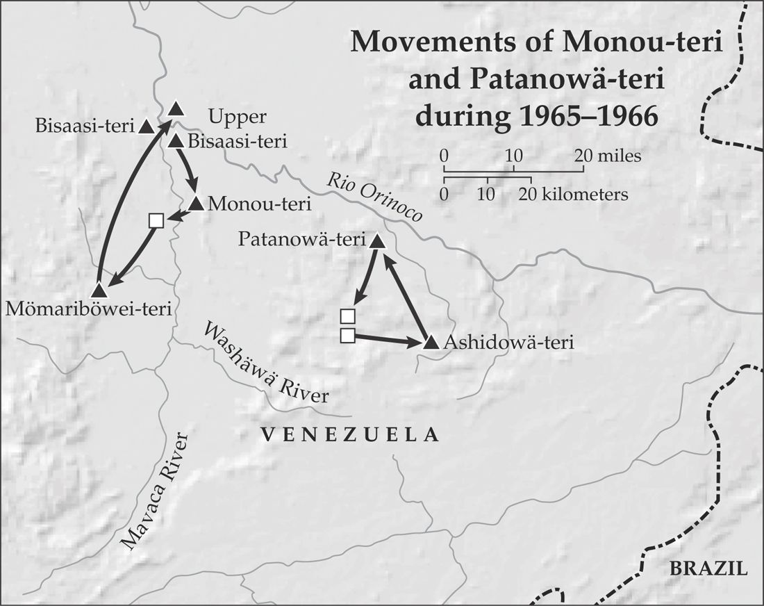 The Patanowä-teri embarked on what I considered to be a brilliant military strategy. Instead of spending time attempting to raid all of the relatively minor groups that were now attacking them with undeserved boldness, they concentrated their efforts on just a few of their more notable adversaries, like the large village of Hasuböwä-teri, just a day and a half to their east. They had previously once rendered the Hasuböwä-teri militarily impotent by systematic raids that targeted their political leaders, their waiteri —men with reputations of ferocity. They boasted to me that they killed most of them and regarded the others there with contempt because they were cowards. When I first met the Patanowä-teri in early 1965, they scoffed at the mere mention of the Hasuböwä-teri; they sardonically dismissed them by saying that they were now “like women” because the Patanowä-teri had killed all their waiteris. Now, with the Bisaasi-teri hostile toward the Patanowä-teri, the Hasuböwä-teri were trying to reassert themselves. To deal with this the Patanowä-teri conducted what contemporary military analysts might call preemptive strikes: they killed the remaining few Hasuböwä-teri waiteris, thus neutralizing, in their view, this possible threat. That enabled them to concentrate on the Bisaasi-teri/Monou-teri/Shamatari alliance to their west because all was now relatively quiet on their eastern front.