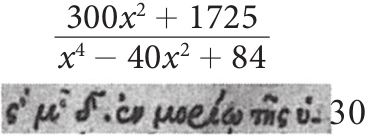 欧几里得《几何原本》(MS D’Orville 301)9世纪版的第二卷、第五卷和第七卷,都无意间利用几何的语言处理代数,也就是说量被刻画成给定的线段长,成为譬如二次方程式x 2 +ax =b 2 (用我们现代的记法)的解,其中a 和b 是正数。对身处21世纪的我们而言,它是两个代入x 后,可以使得方程式成立的数;以其中任一个数代入计算,可使得等号的左边与右边相等。但对生活在15世纪之前的人来说,方程式的解是在没有符号的情况下求得的,同时,他们还依循了什么东西 可被视为数的一种具体观点。