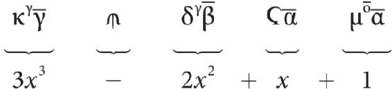 在该书中,对某位名为戴奥尼修斯(Dionysius,无关酒神的另一位)的人士,提出关于平方、立方和数字的其他一般性质的难题并求解时,作者根据字母来为平方、立方定义名称,并将未知量表示为