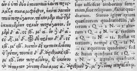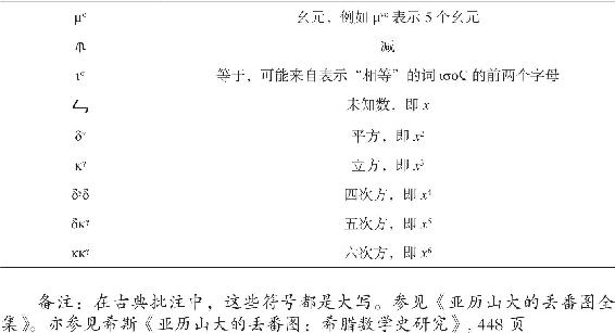 符号化的现代数学,最基本的形态可以追溯到丢番图的《算术》一书。我们应提醒读者,该书的原始文本现已不存,所以在复本上发现的任何记法,都可能是抄写员或翻译者添加的。