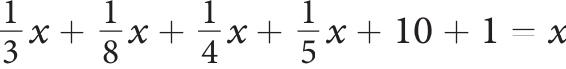 你知道x 是多少吗?借由我们的符号代数工具,我们可以解这个方程式。合并同类项,同时从等号两边减去x ,很快求得答案:x =120个苹果。