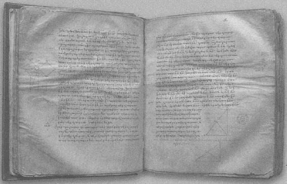 我和这部伟大的文献单独留在房间里。与这样一部古代手稿独处的震惊、兴奋和荣耀之情,我实在无法形容。我就像是在中世纪修道院里的僧侣,像是在自家波希米亚图书馆里的伯爵,也像牛顿一样细细思索着为什么这份抄本里没有符号这个问题。单独在这个房间里,我觉得自己在精神上与上一个千禧年的所有昔日学者、抄写员和数学家有了一种关联,特别是与书记员史蒂芬(Stephan the Clerk),他在888年戮力为帕特拉斯的阿力他(Arethas of Patras)将这部作品抄写到羊皮纸上。我戴着白手套的手指小心地翻阅MS D’Orville 301的书页(参见图9-1)。