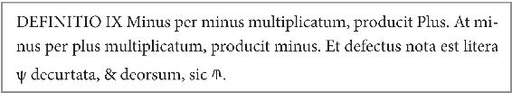 ,尽管它比一般文本中所用的sigma更大且更加倾斜。它可能是“数”这个词的古希腊文前两个字母的草书体缩写。也许它并非我们现在看到的样子,但著名的古代数学史家托马斯·希斯认为,它可能是在日益严重的马虎抄写过程中慢慢演变的结果。丢番图也创造出减号,它就像一支朝上的箭(有时是朝下)。但这也是一种缩写形式——很可能是“减”这个词的前两个字母,同时,其中一个套着另一个。或者,那可能只是后世的某位抄写员自己想出来的,利用这些符号当作缩写。