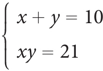 然而,请记住,这个问题不像是通过文字表述的方式解出来的。它可能一开始是在某种沙板上做研究,接着再形成文字表述。再者,如何将10分成两部分,使得其乘积为21的这个问题,有一个利用心算的简单解法:21的因子中,只有3和7这两个因子满足其和为10。这也是标准的巴比伦式几何问题:列出两个部分x 和y ,接着,考察这个问题,x 和y 分别为一长方形的两边,且满足其和为10,面积为21。这个几何问题可以用下面涉及两个方程式的代数问题表示: